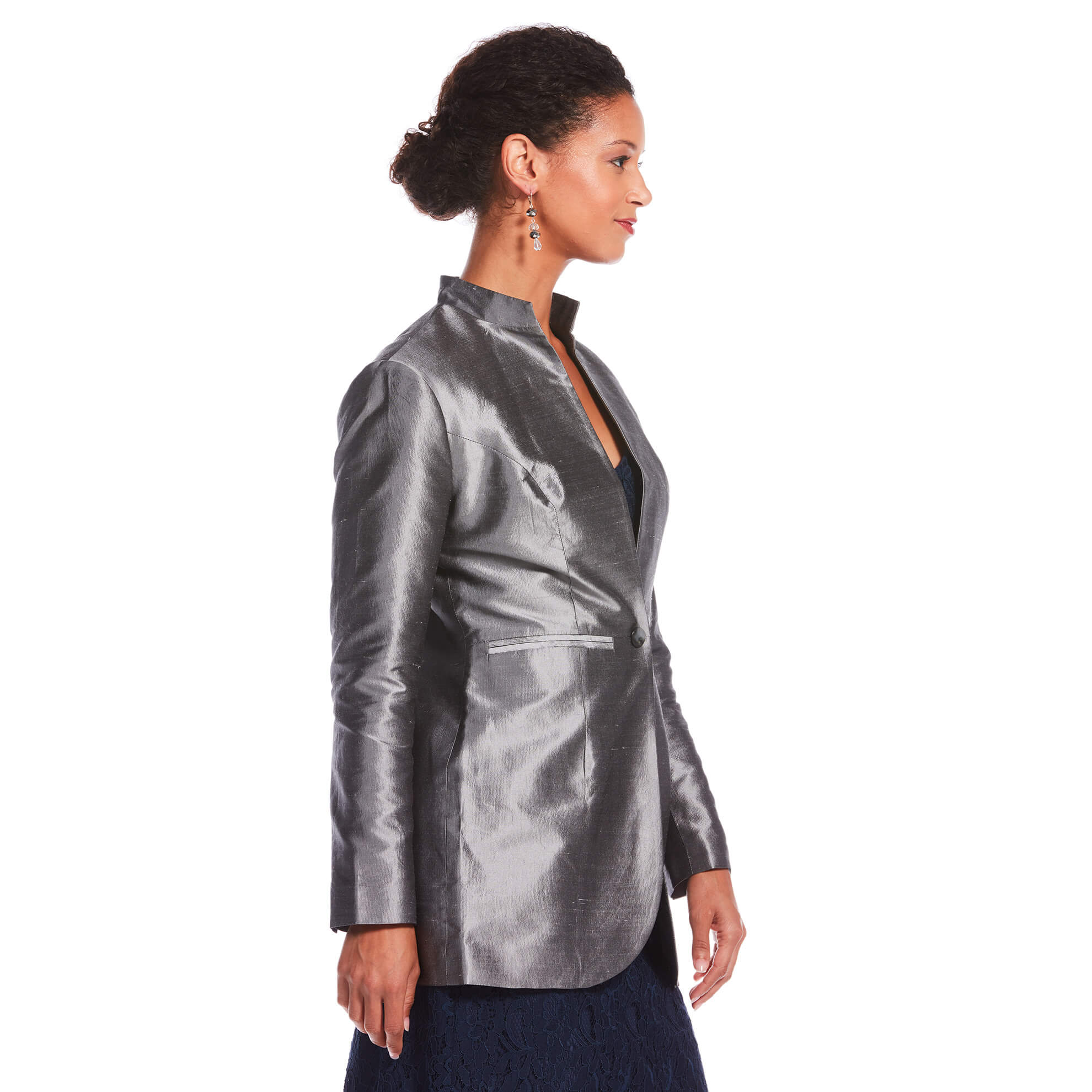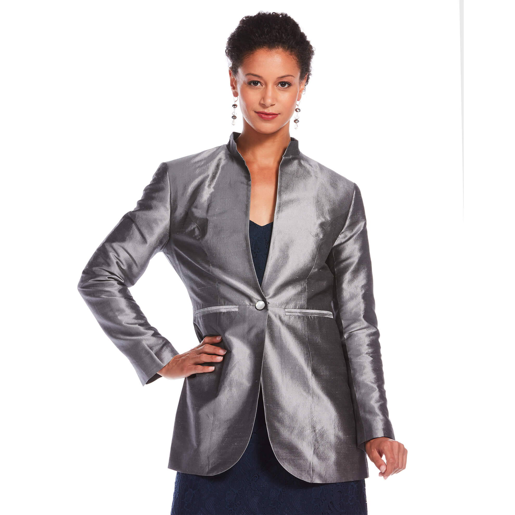Totally Rational Jetset Blazer (No. 5841). Fitted blazer in lustrous silk dupioni. Stately band collar. Real shell shank button at front waist. Fitted with light shoulder pads. Front and back princess seams. Double-welt pockets at front waist. Imported.