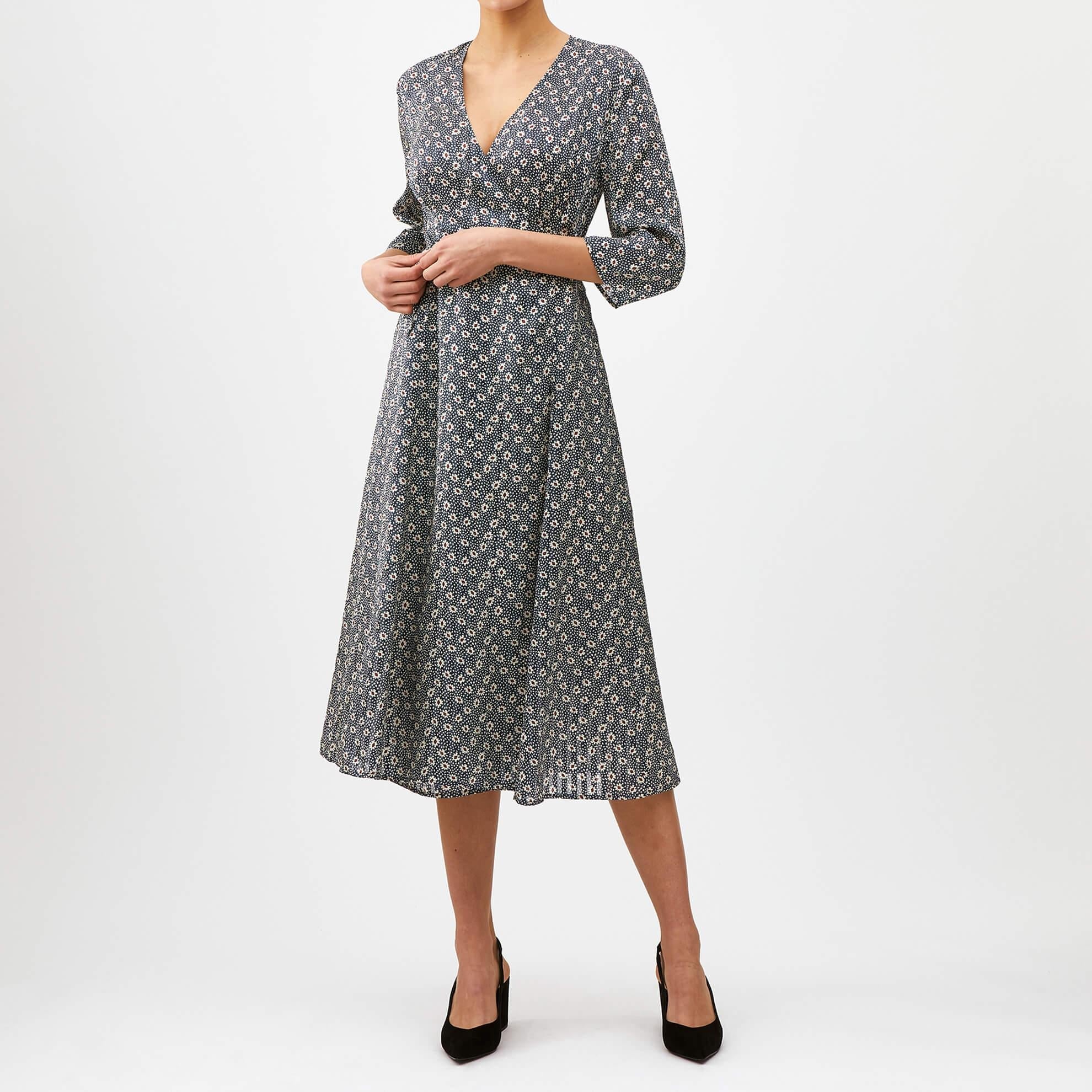 Bella Figura Dress (No. 6487). Luscious silk wrap dress with vintage, hand-painted floral print sourced from the Ratti vault in Como, Italy. Self-fabric belt. Three-quarter sleeves. Lined skirt. Print is White and Red over Navy. Imported.