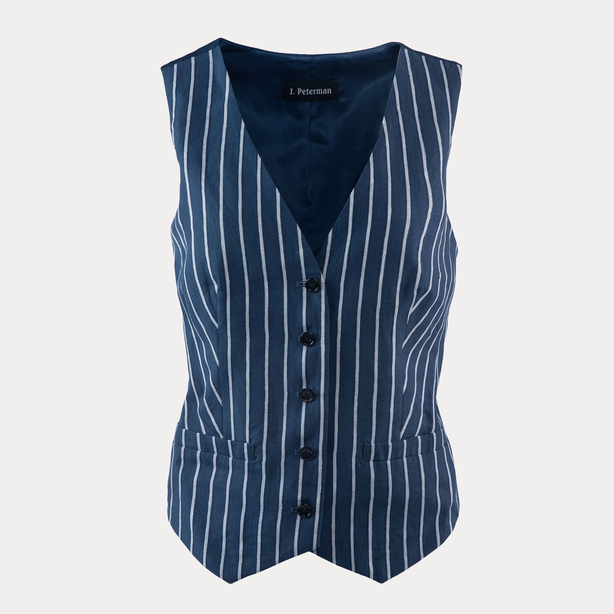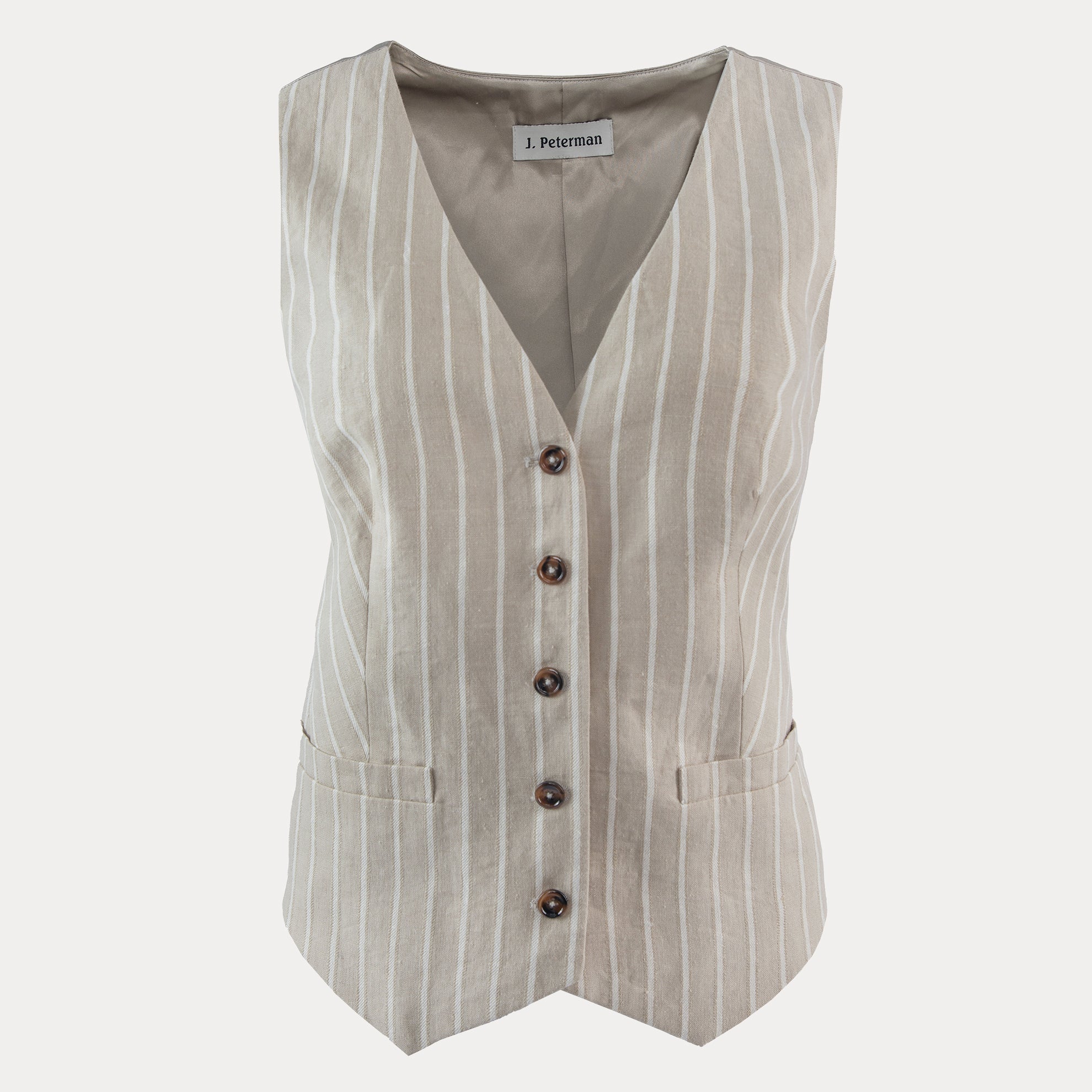 Optimistic Linen Vest (No. J8250) in a seasonally-perfect linen cotton blend. Slim-fit suiting lengthens and slims. Single back vent. Two front pockets at waist. Four faux horn buttons down center front, three at each cuff. Lightweight poly viscose lining. Imported.