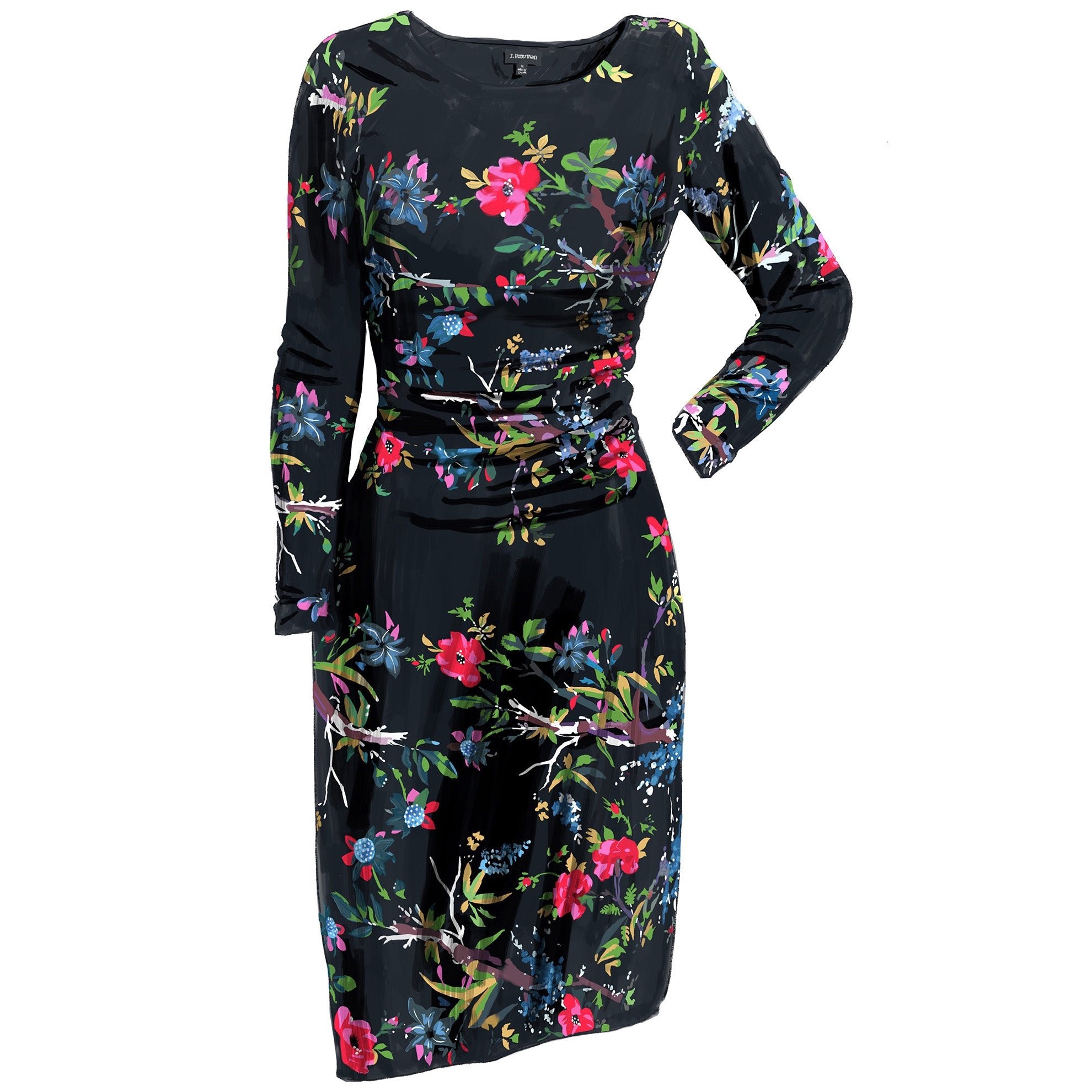 95% rayon 5% spandex shell. White and black rose print. Jersey knit 100% rayon lining. Elastic side seams at ruching. Knee length. Dry clean only.