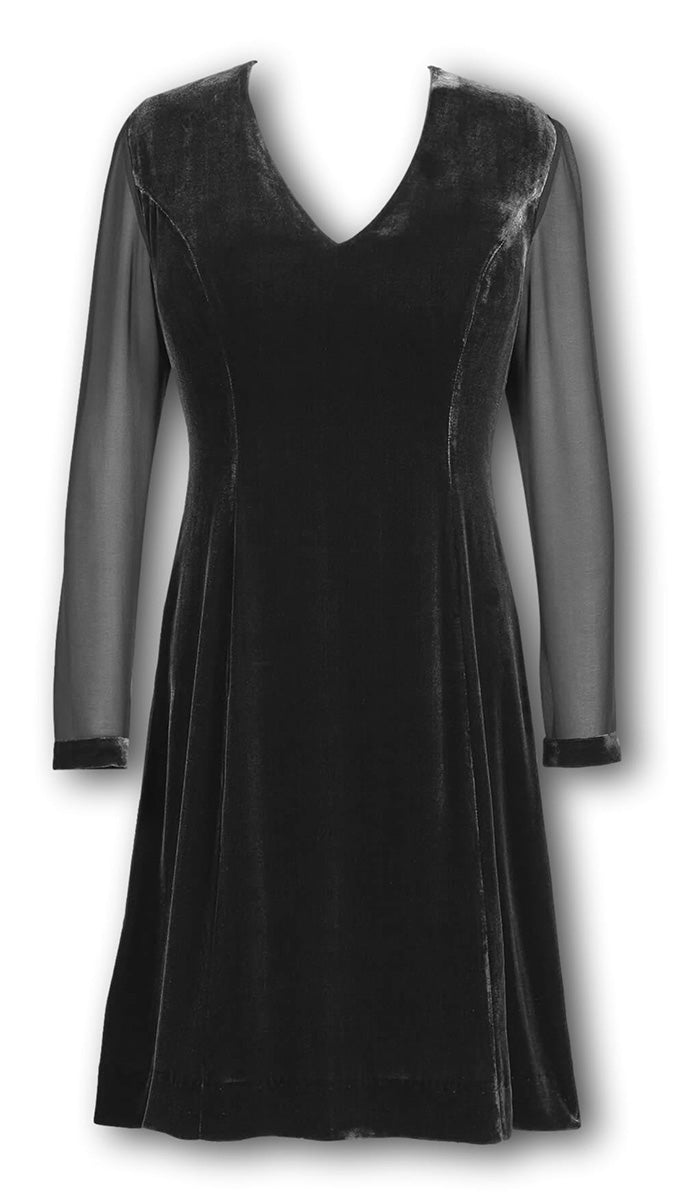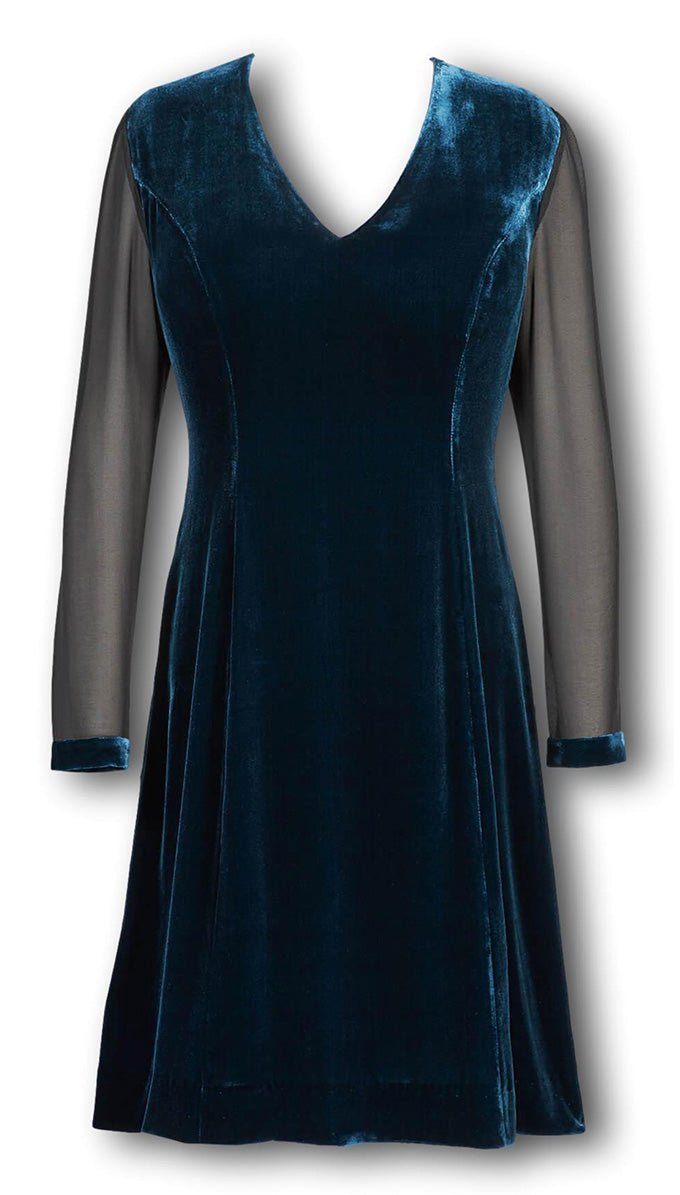 Velvet & Chiffon Dress (No. 6179). The extravagant silk blend velvet takes the lead in this sophisticated piece. But it’s the 100% silk chiffon sleeves that are the real heroine here. Note the exquisite wrist detail with the adjustable velvet cuff. Body is lined, chiffon sleeves are unlined. V-neckline, flattering front and back princess seams. Imported.