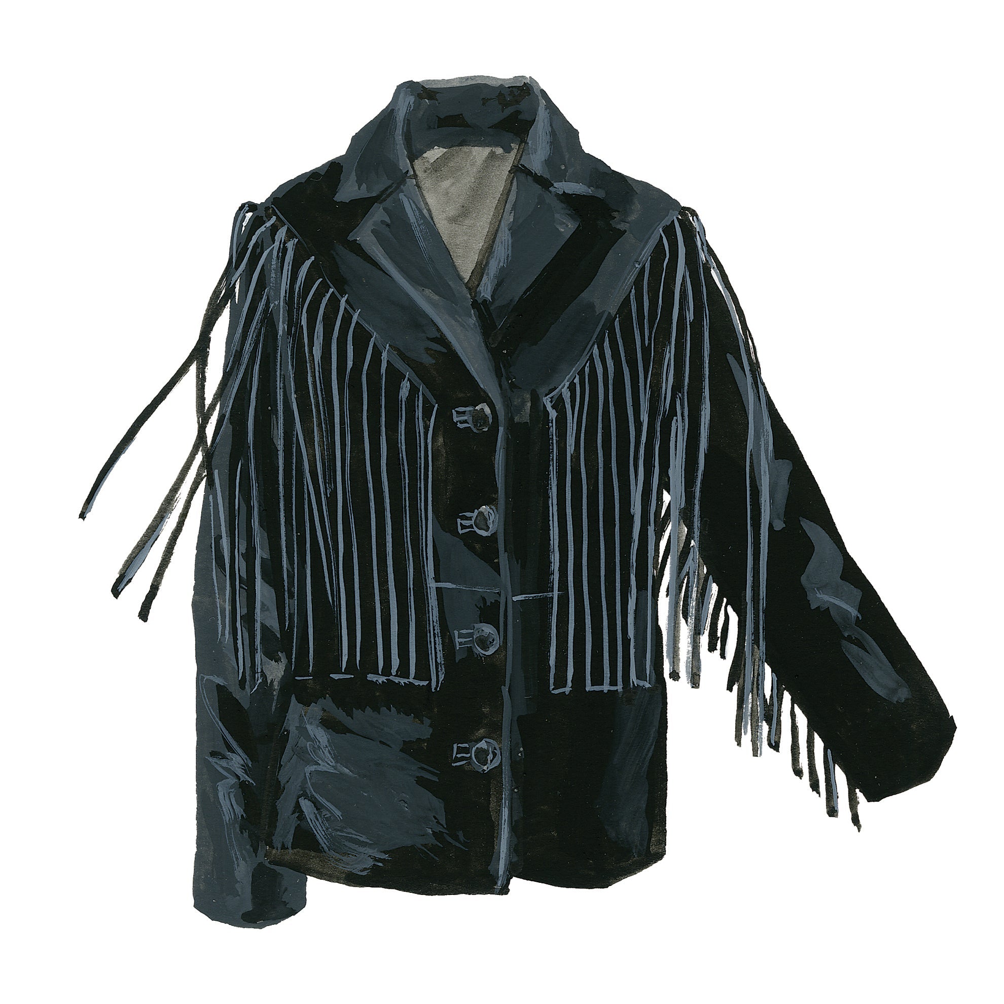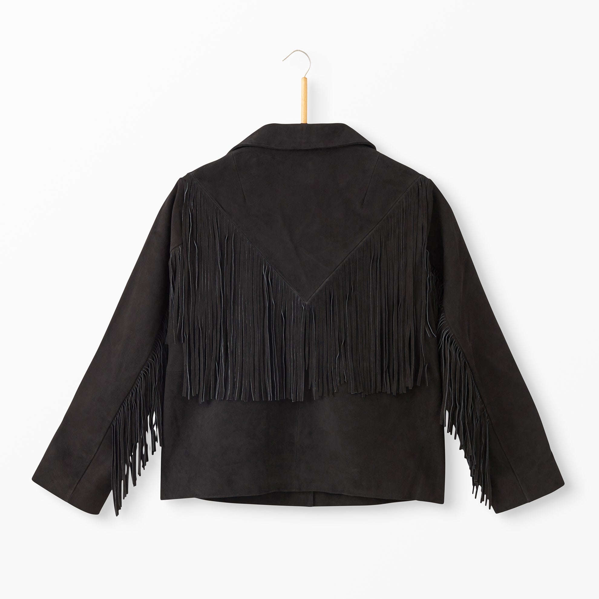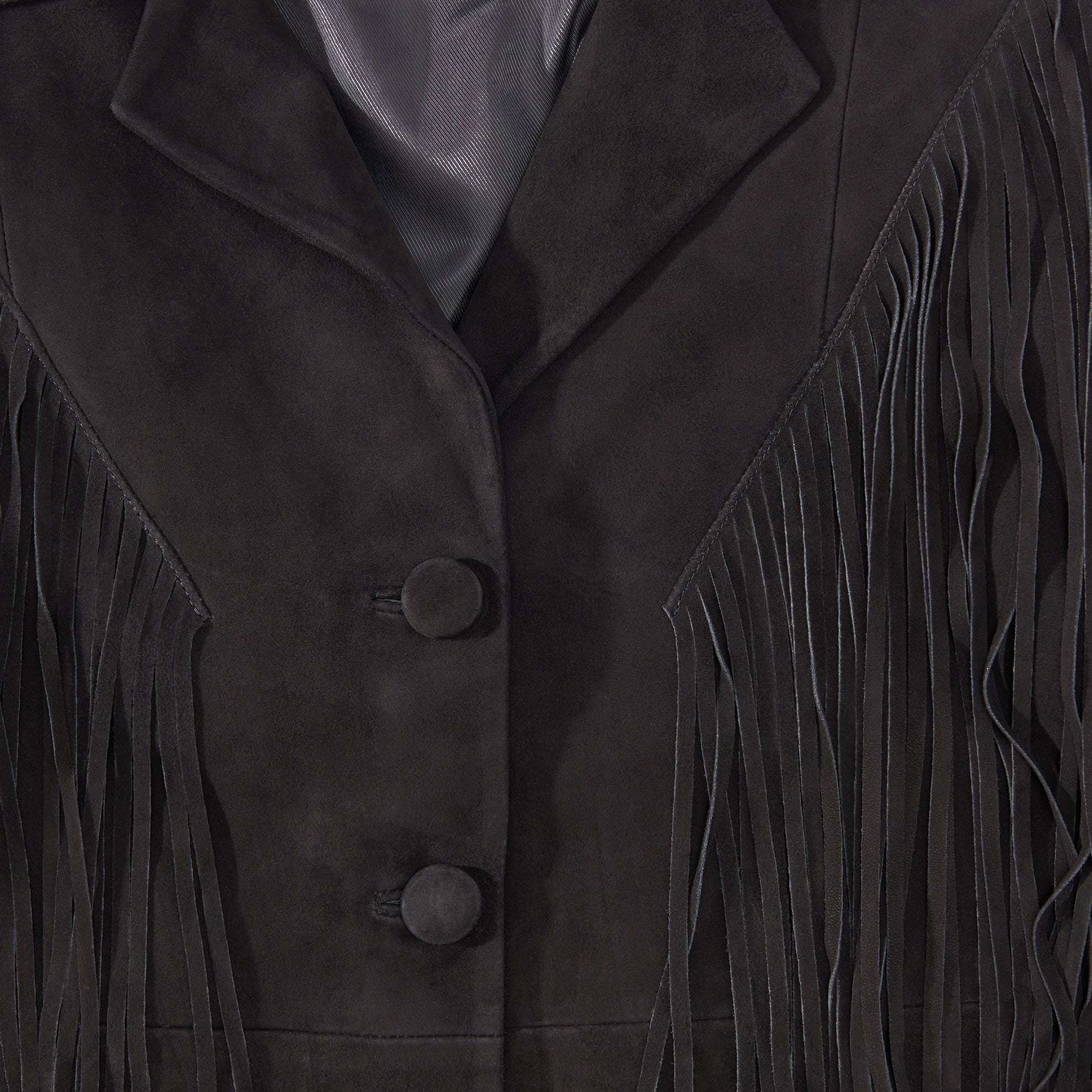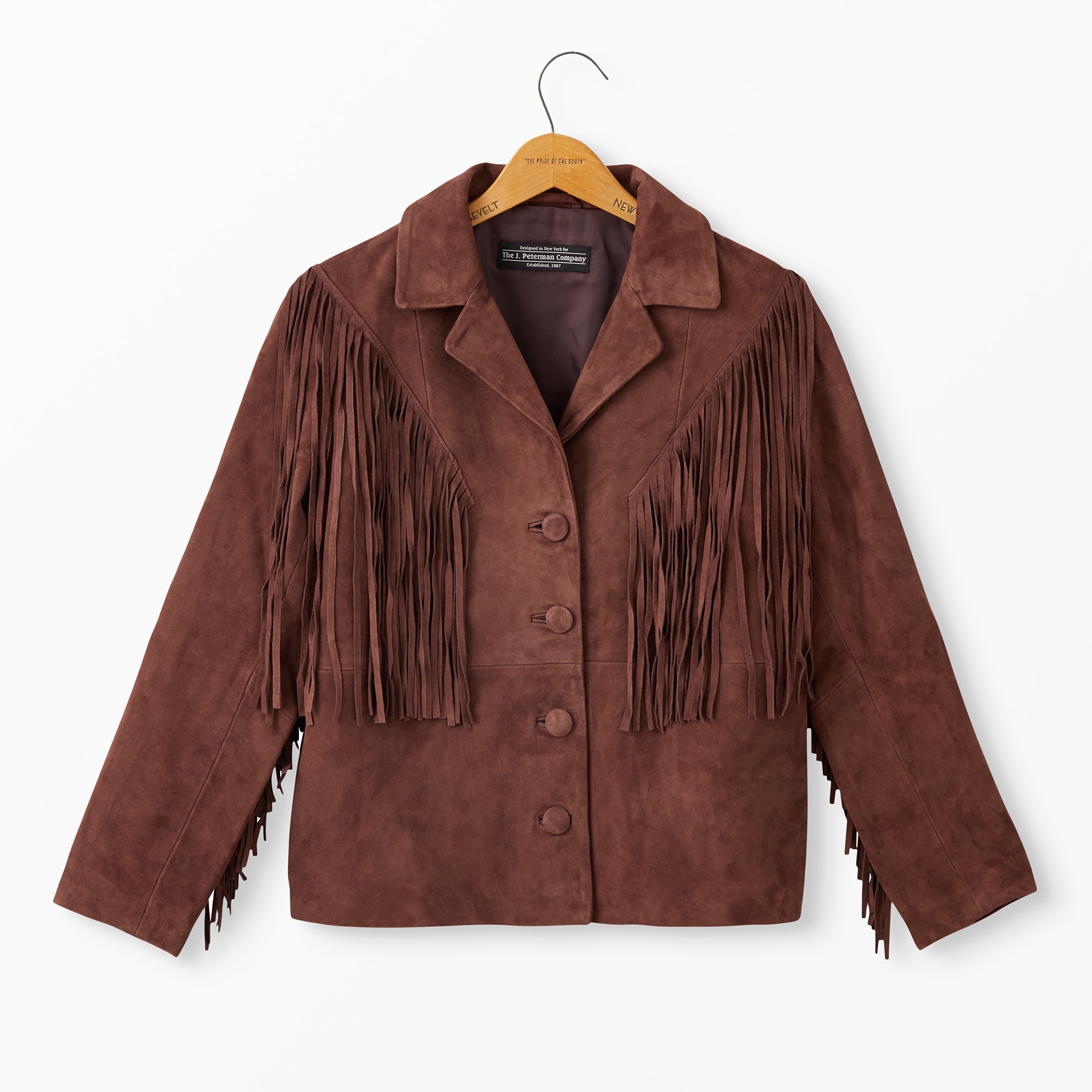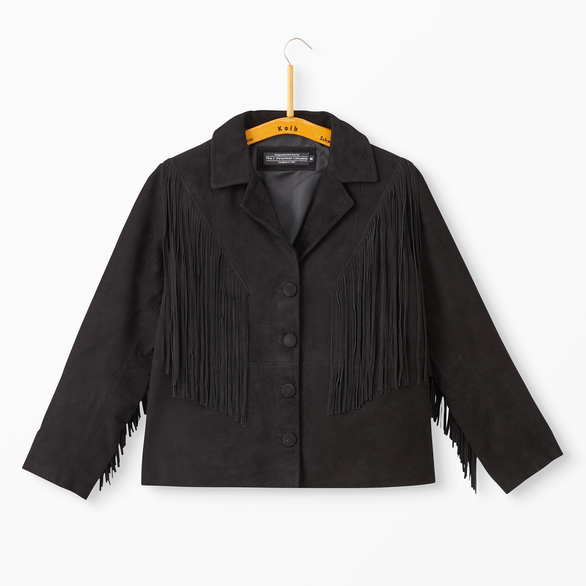 Fringe Suede Jacket (No. J7047). Classic Western fringe jacket by way of Italy, where they know more than most about how to make such things just right. Artfully and meticulously constructed from 100% goat suede. Lined in Korean twill. Suede-covered buttons. Fringe along front and back yoke and sleeve seams. Notched collar. Back and front yokes come to a point. Slightly cropped. Made in India.
