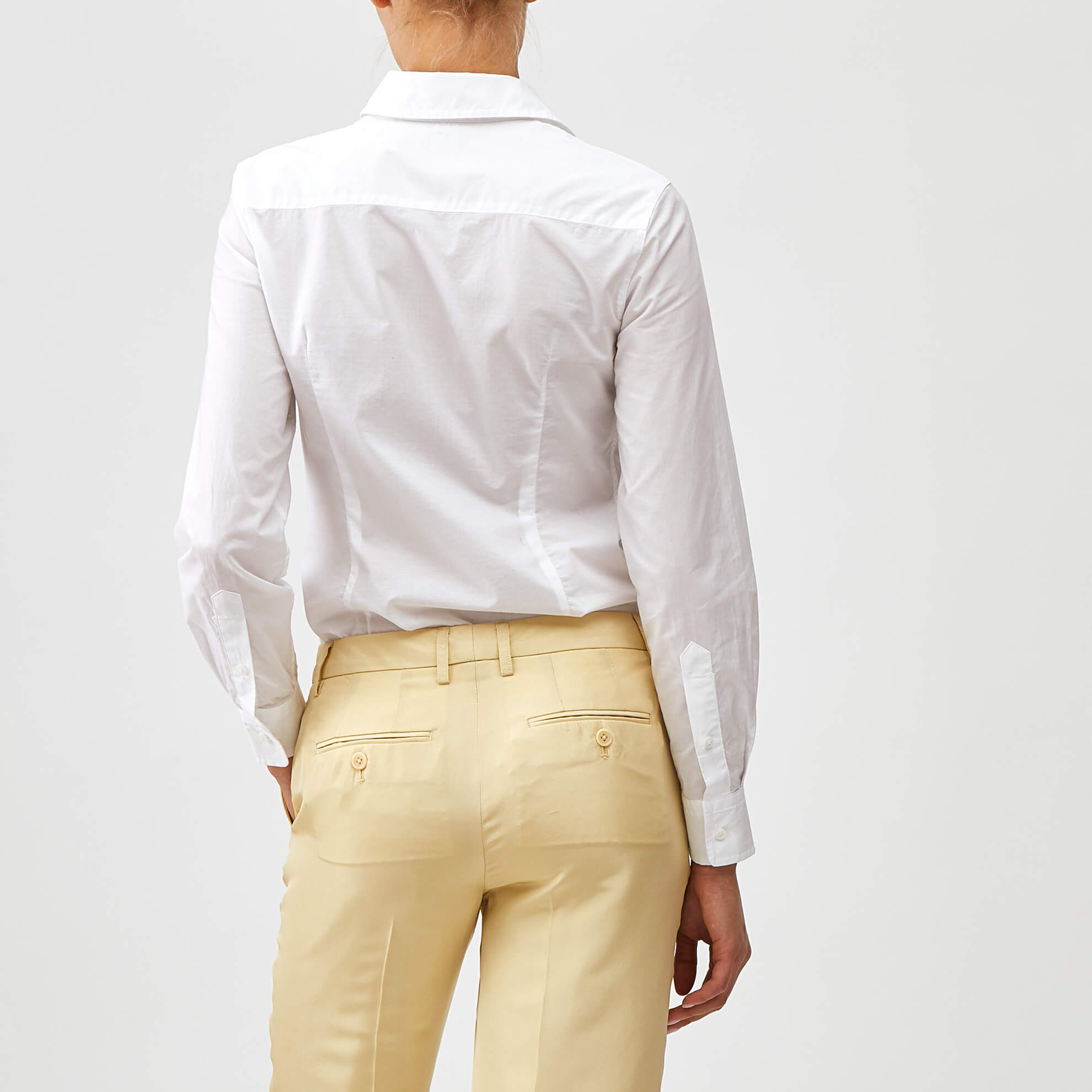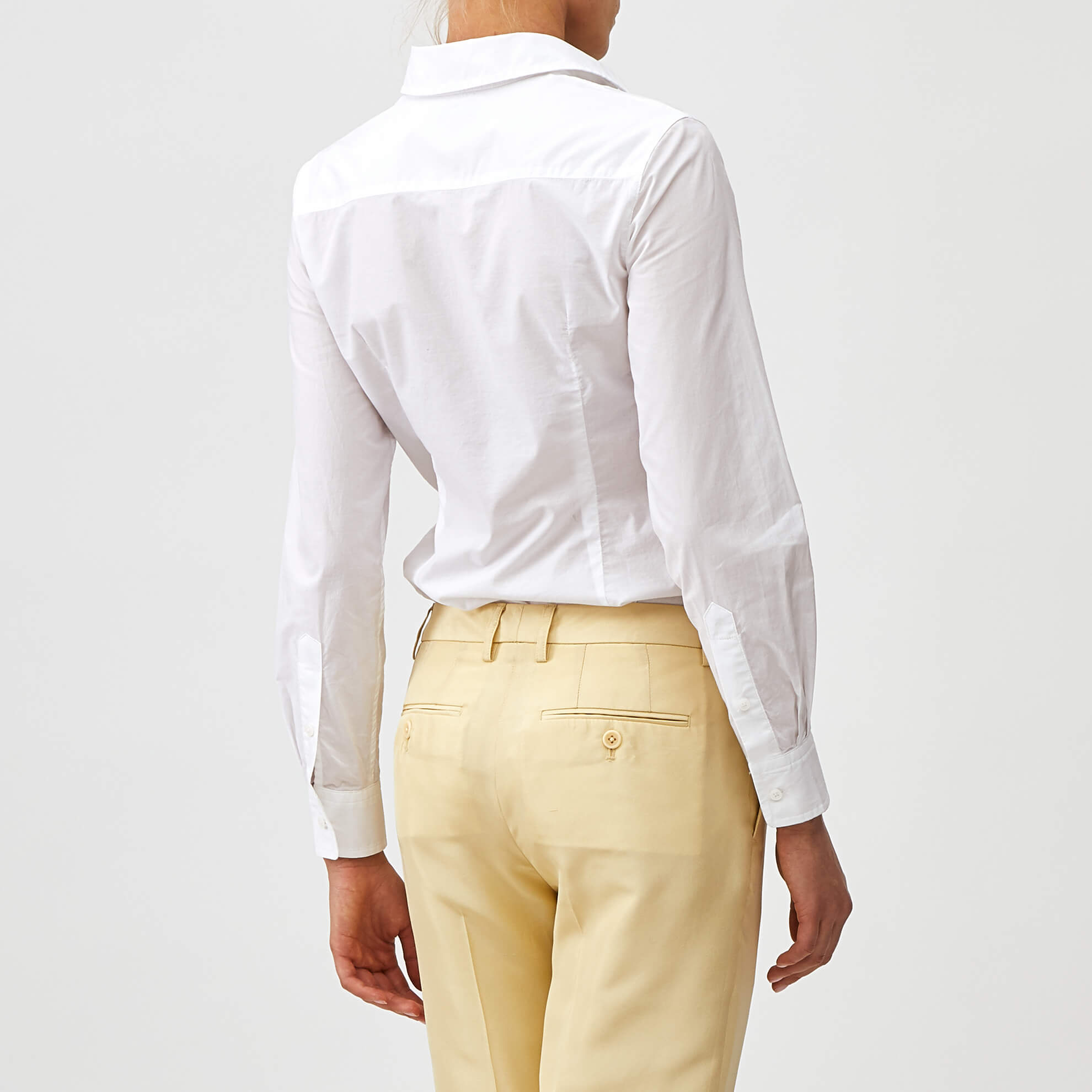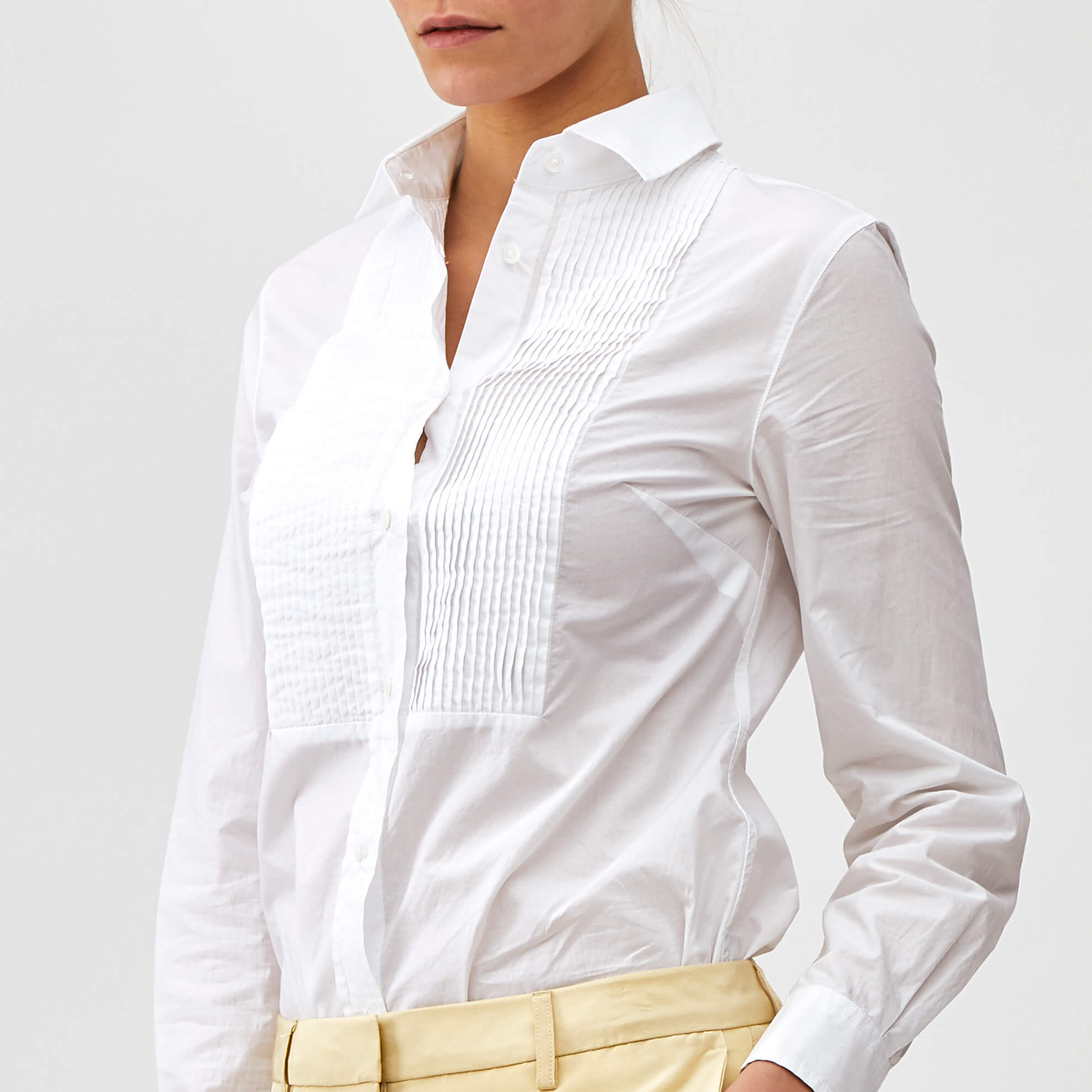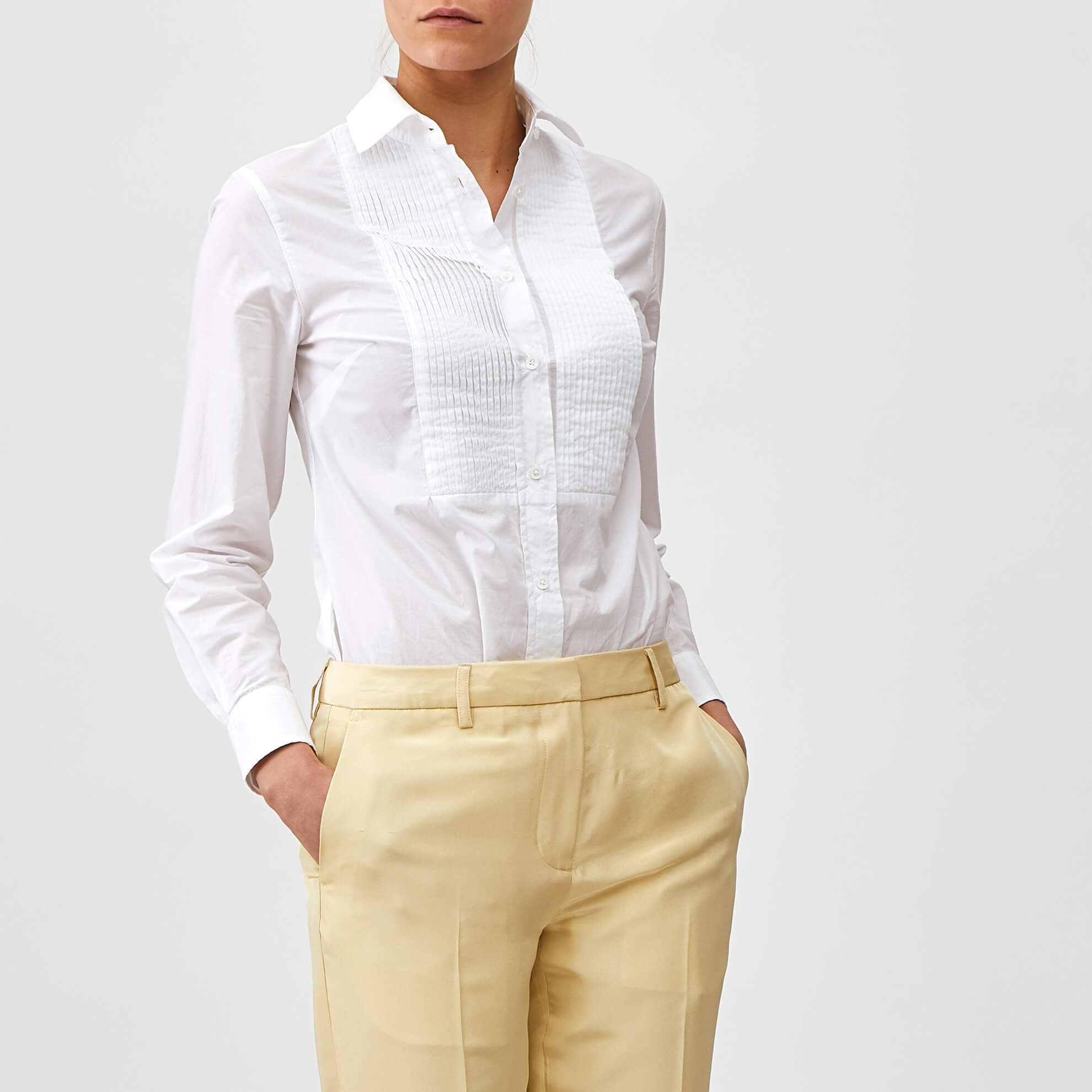 The details—luxe Italian cotton, pieced-in bib, point collar. Dietrich would admire your utter disregard for boundaries. Classic long sleeve tuxedo blouse in pure Italian “breza” cotton, woven with softness and freedom in mind. Unlined. Pieced-in bib. Shell buttons. Offered in a stunning ultra-white. Excellent by itself, riotous with our leather blazer. Imported.