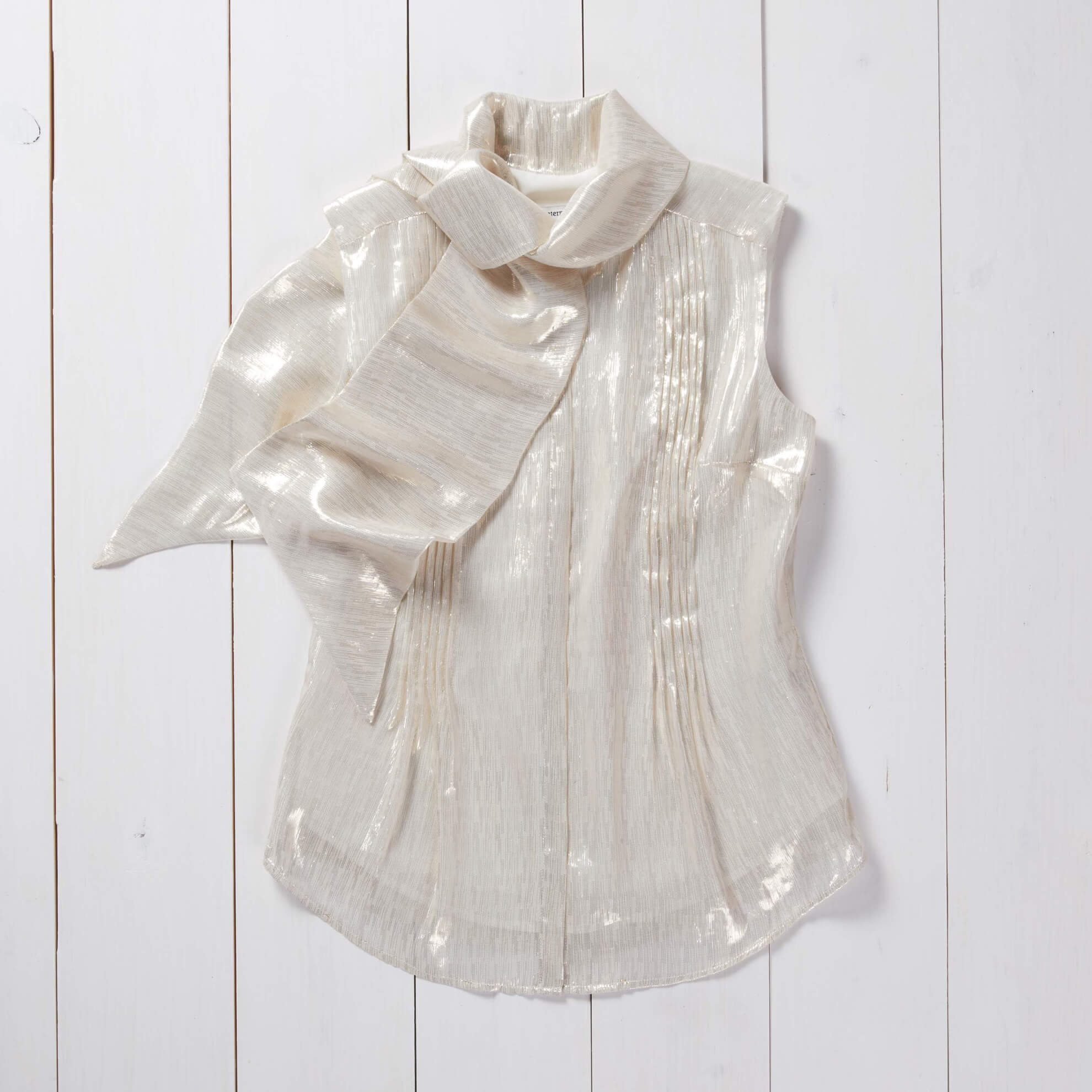 Dazzling Metallic Blouse (No. 5819). Show-stopping button-front blouse in luminous silk chiffon blended with gold and silver metallic shimmer. Self-fabric tie secured at back neck. Pintuck detail down front, bust darts, and French seam finishes. Stretch poly lining for easy movement. Seven hidden trocas shell buttons down center front. All dazzle. All delivery. Imported.