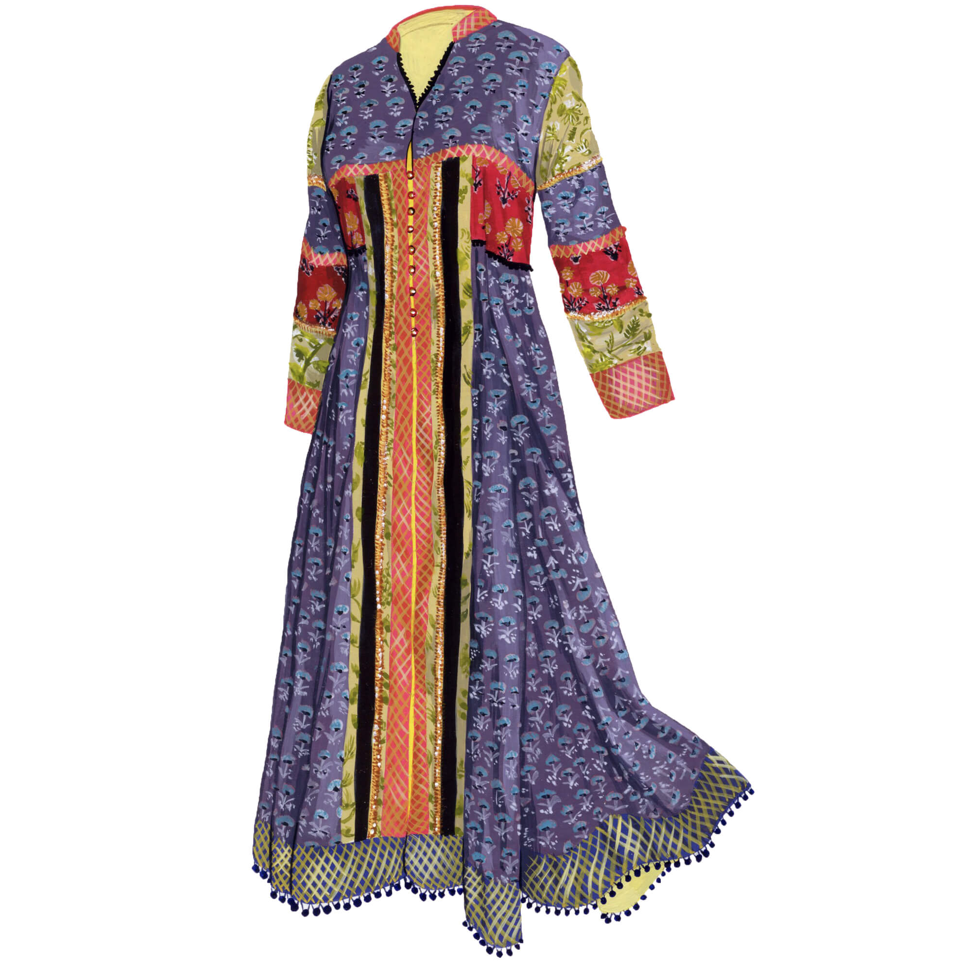 Jaisalmer Dress (No. J6486). Low-calf length cut of pure cotton, bodice lined in 100% cotton. Multi-panel design with high-waisted bodice, full-gored skirt. Mandarin collar and V-neck. Navy pom-pom trim at neck and around full sweep. Braided belt with cord ball on each side of waist. Metallic round buttons. Gold sleeve trim. Upper bodice lined in cotton.