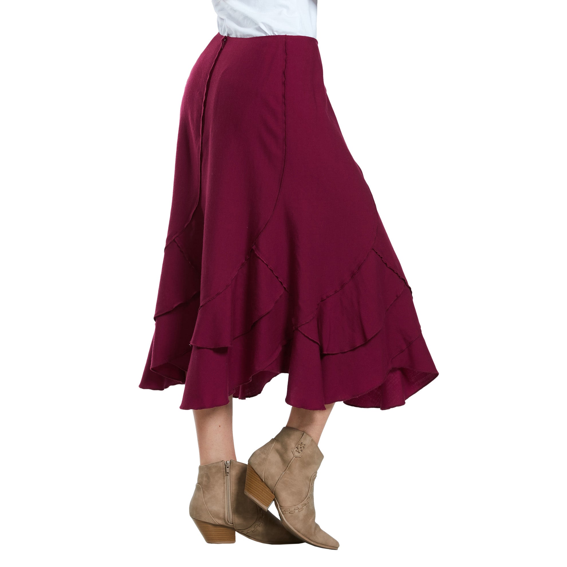 This long skirt is 100% wool with an invisible zipper in the back. It has layered curved panels and a taffeta lining. Dry clean only.