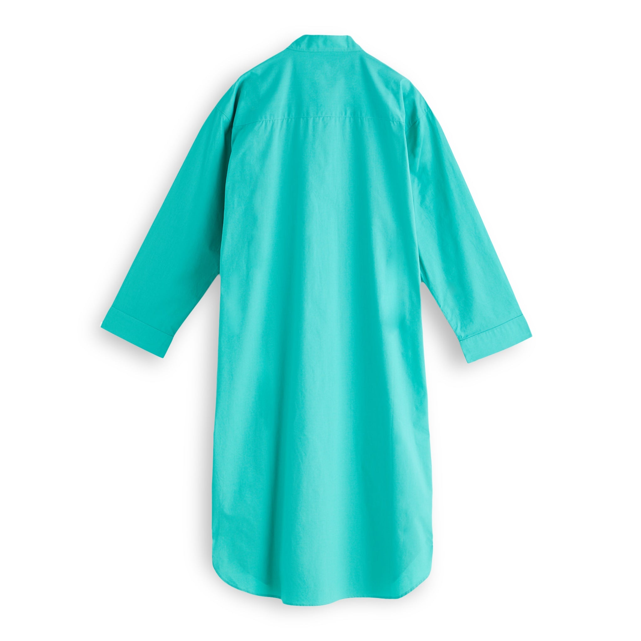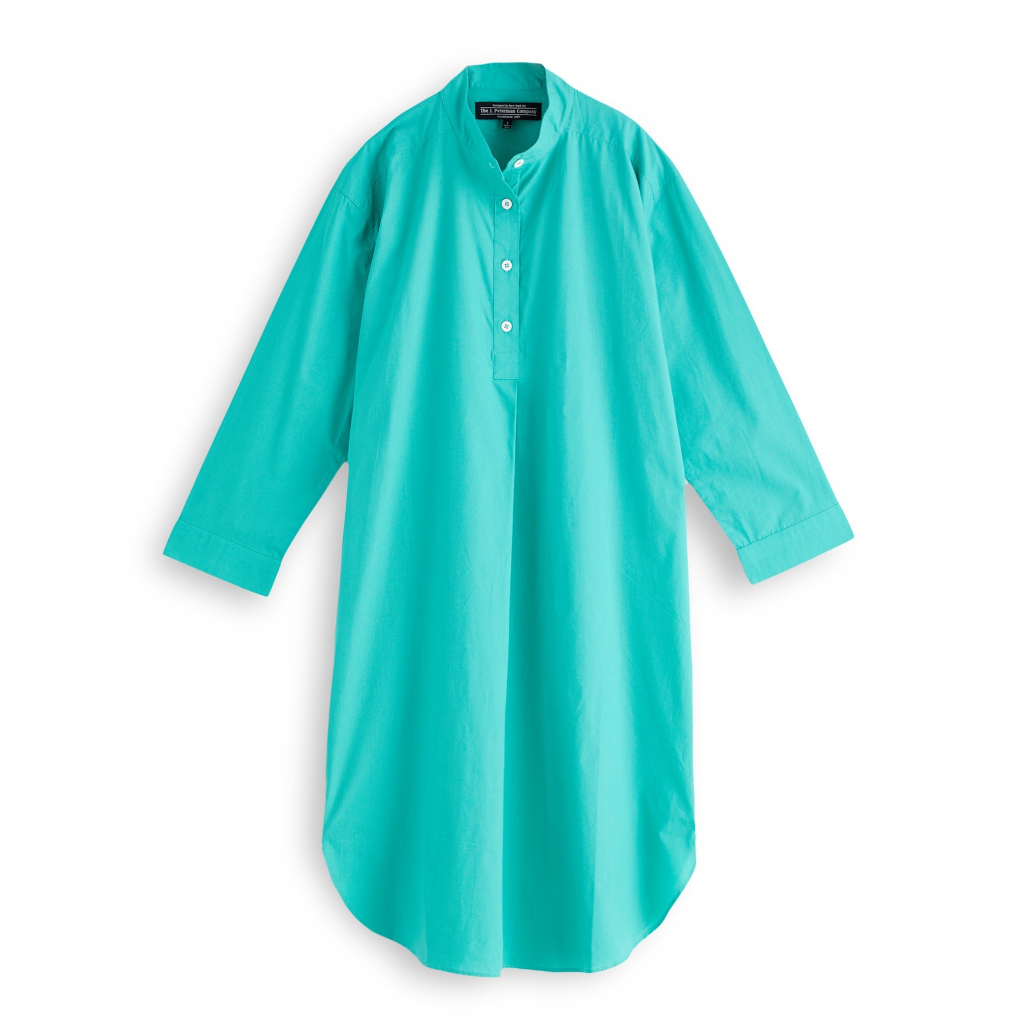 Marie Antoinette Nightshirt (No. J1019). Innocent it is. No lace. No embroidery. No gewgaws. Pure Pima cotton (the best there is). Band collar. Shirttail hem. Four-button placket. Chalk poly buttons at center front. Falls below knee. Sleep in it, walk along beaches in it, visit a secluded meadow in it. Imported.