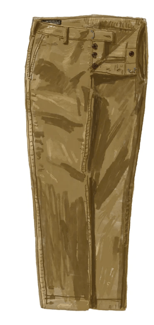 Notable features: Four pockets. Military grade melamine buttons. Hook and bar closure and zipper at center front. Extended waistband tab. 1/4” hand pockets. Welted back pockets. Front coin pocket. Double needle stitching throughout. Cotton twill waistband lining and pocketing.