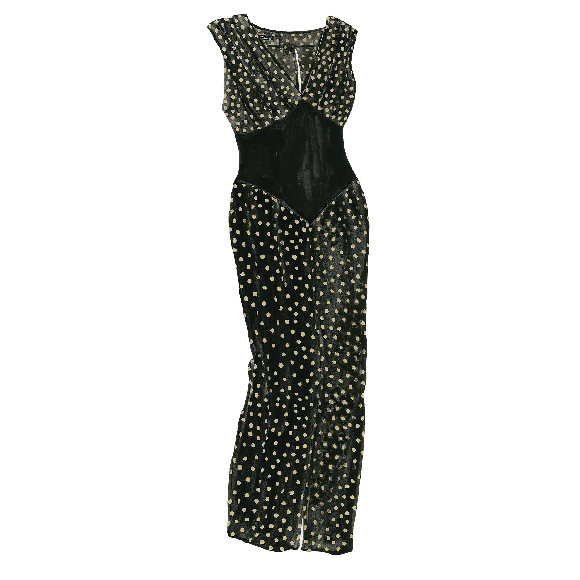 Silk Polka Dot Column Dress (No. J7811). Lovely silk crepe de chine column dress in a vintage allover polka dot print. Bust-enhancing shirring complements the flattering waist yoke at front and back, made in a wonderful silk cotton blend. One faux horn button and two hook-and-eye closures at back neck. Four faux horn buttons at back waist. Light shoulder pads and shoulder pleating. Poly crepe de chine lining. Center front slit to knee. Lots of va-va-voom. Imported.