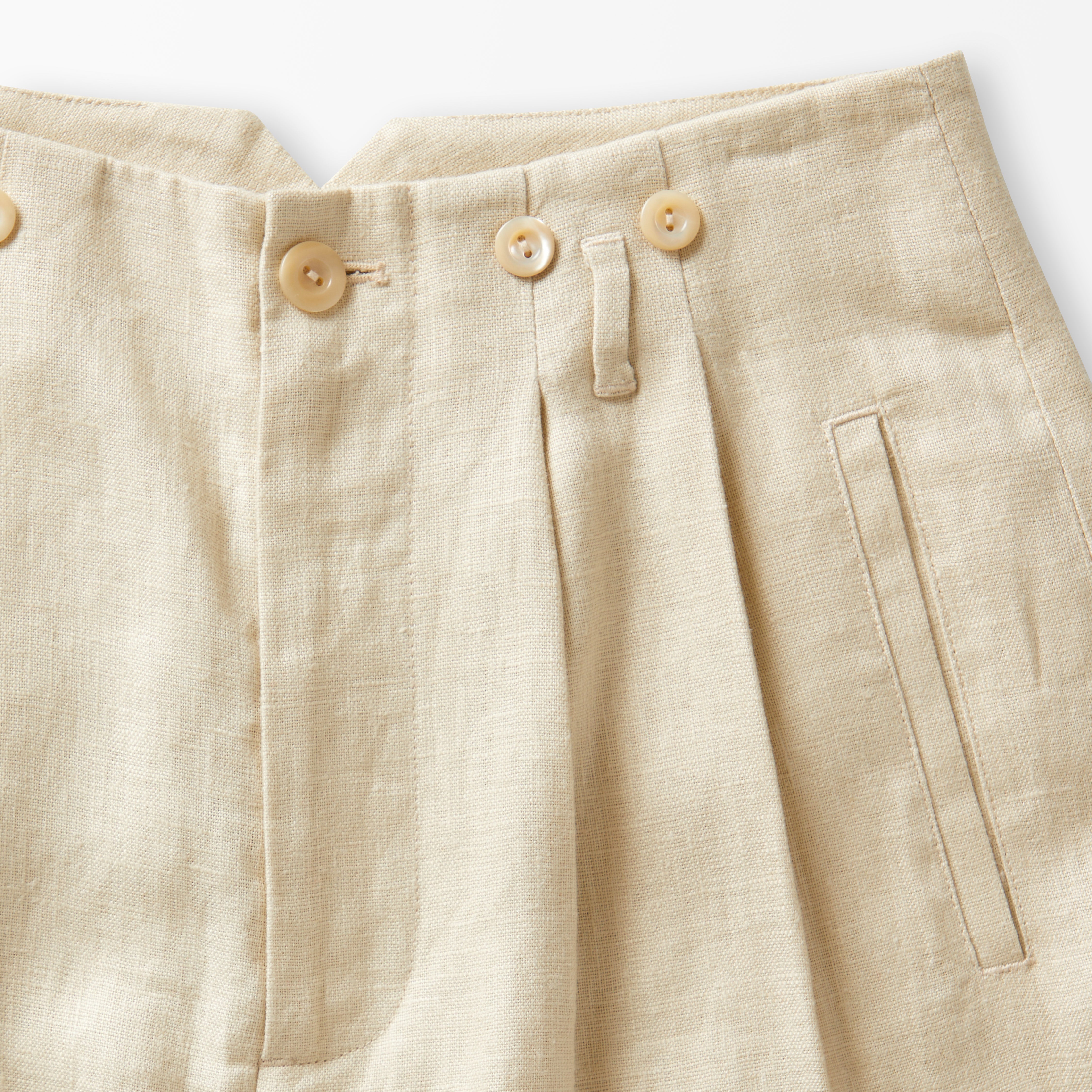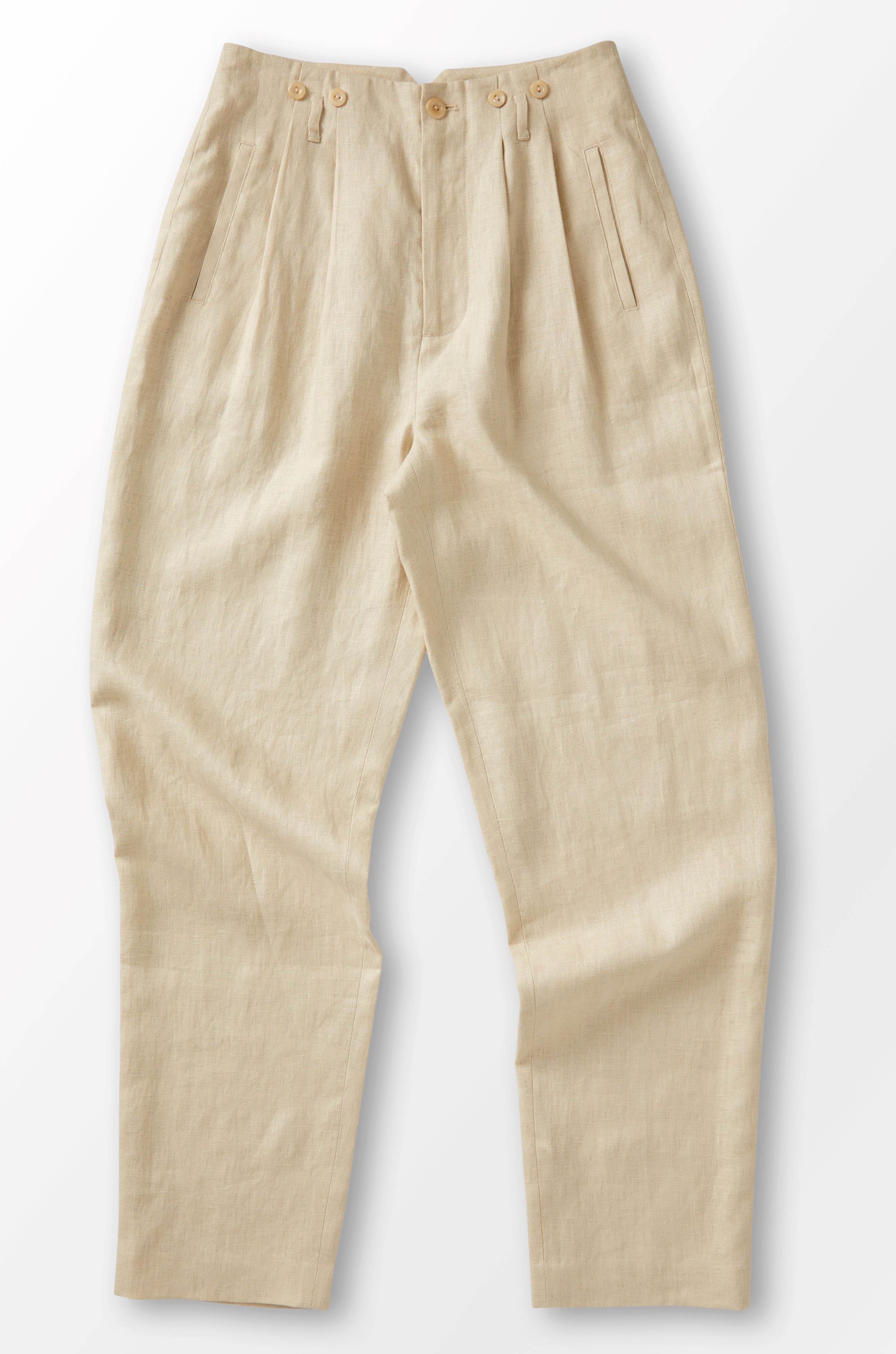 The Linen Glamour Pants (No. J8252). Pure linen. French zipper fly, four stitched-down front pleats, suspender buttons front and back. No waistband. Sits at natural waist. Four narrow belt loops. Two button-through double-welt back pockets and two off-seam vertical welt front pockets. 31" inseam. Half-leg and pocket lining. Yes, glamorous. Imported.